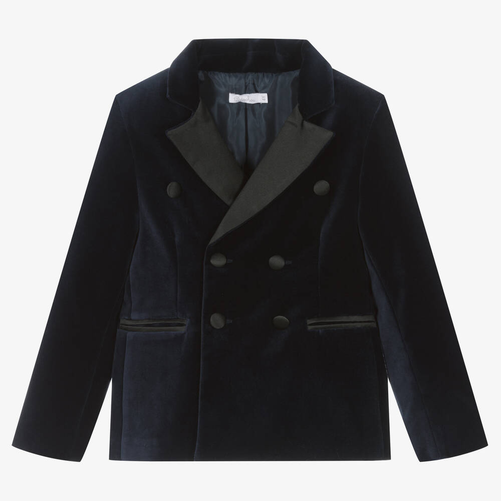 A sophisticated navy blue blazer for boys by Patachou, made from soft velvet. Double-breasted in style, it has black satin trims on the notched lapel collar, welt pockets, and covered button fastenings and detailing on the front and the cuffs. Super stylish, this blazer is great for parties and special occasions.