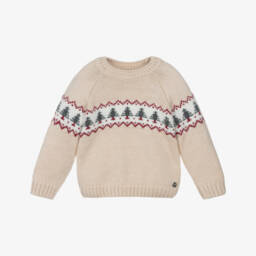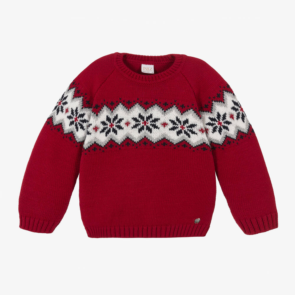 Casual red sweater for boys and girls by Spanish brand Paz Rodríguez, knitted in a soft, mid-weight wool blend. Ideal for layering, it has a lovely, traditional Fair Isle pattern across the chest in white, grey and navy blue. There are long sleeves, cosy ribbed trims and a silver logo disc by the hem.