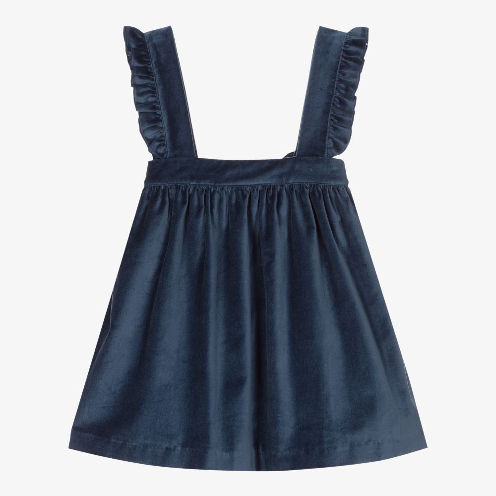 Navy blue pinafore dress for girls by Phi Clothing, made in soft cotton velvet. Designed to be worn with a top or blouse, it has a gathered skirt with frilled shoulder straps. It is elasticated around the back with a sash that ties in a bow.