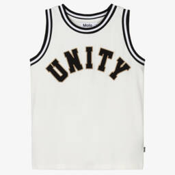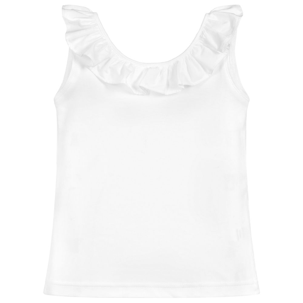 Girls cute white sleeveless top by Phi Clothing, made in soft and stretchy cotton jersey. It has a pretty ruffle around the neckline, with a large bow on the back.