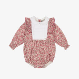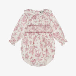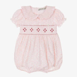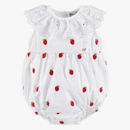 A smart white and beige shortie for baby boys by Piccola Speranza. Designed to look like a two-piece, it has a lightweight, cotton-blend bodice with pintuck pleats and beige trim to match the lower part. This adorable babysuit fastens with poppers on the back and between the legs.