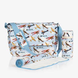 A pale blue backpack for girls by Powell Craft, with yellow trims. Patterned with sunshines and rainbows, it has one main compartment and a smaller front pocket, with zip fastenings. The back is lightly padded for comfort, with two adjustable shoulder straps and a small carry handle.