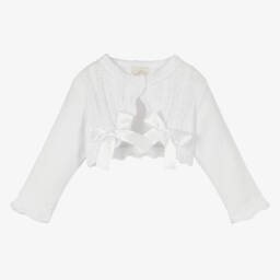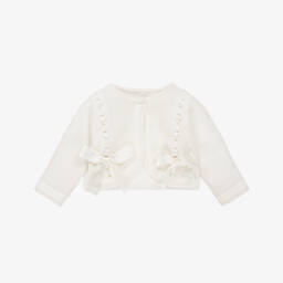 From Pretty Originals, a charming pink cardigan for girls knitted in soft cotton. A hidden button fastening gives a seamless finish to this lovely top which is embellished with faux pearls and two large ribbon bows.