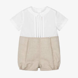 Очаровательный кремовый песочник в морском стиле для малышей от Pureté Du... Bébé в виде двух частей. Верхняя часть из мягкого джерси с элегантным морским воротником и синими и красными полосатыми кантиками. Нижняя часть из полосатого твила с имитацией передних карманов.