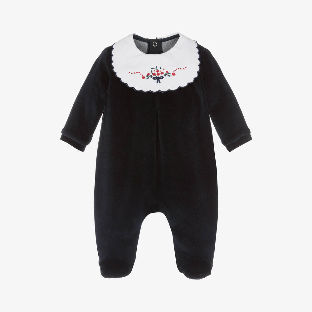 Navy blue babygrow for girls by Pureté Du... Bébé, made in soft velour. Warm and cosy, it has a sweet white collar decorated with green, red and navy blue floral embroidery. There are popper fastenings on the back and between the legs and a rubber logo tab on one side seam.