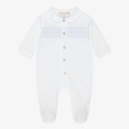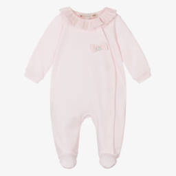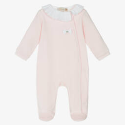 A lovely white babygrow for girls by Pureté Du... Bébé, made in soft cotton jersey. Adding a sweet traditional touch, it has a lightweight voile overlay, beautifully patterned with a pink Toile de Jouy print and trimmed with delicate lace. There are easy-to-use popper fastenings on the back and between the legs to help with dressing.