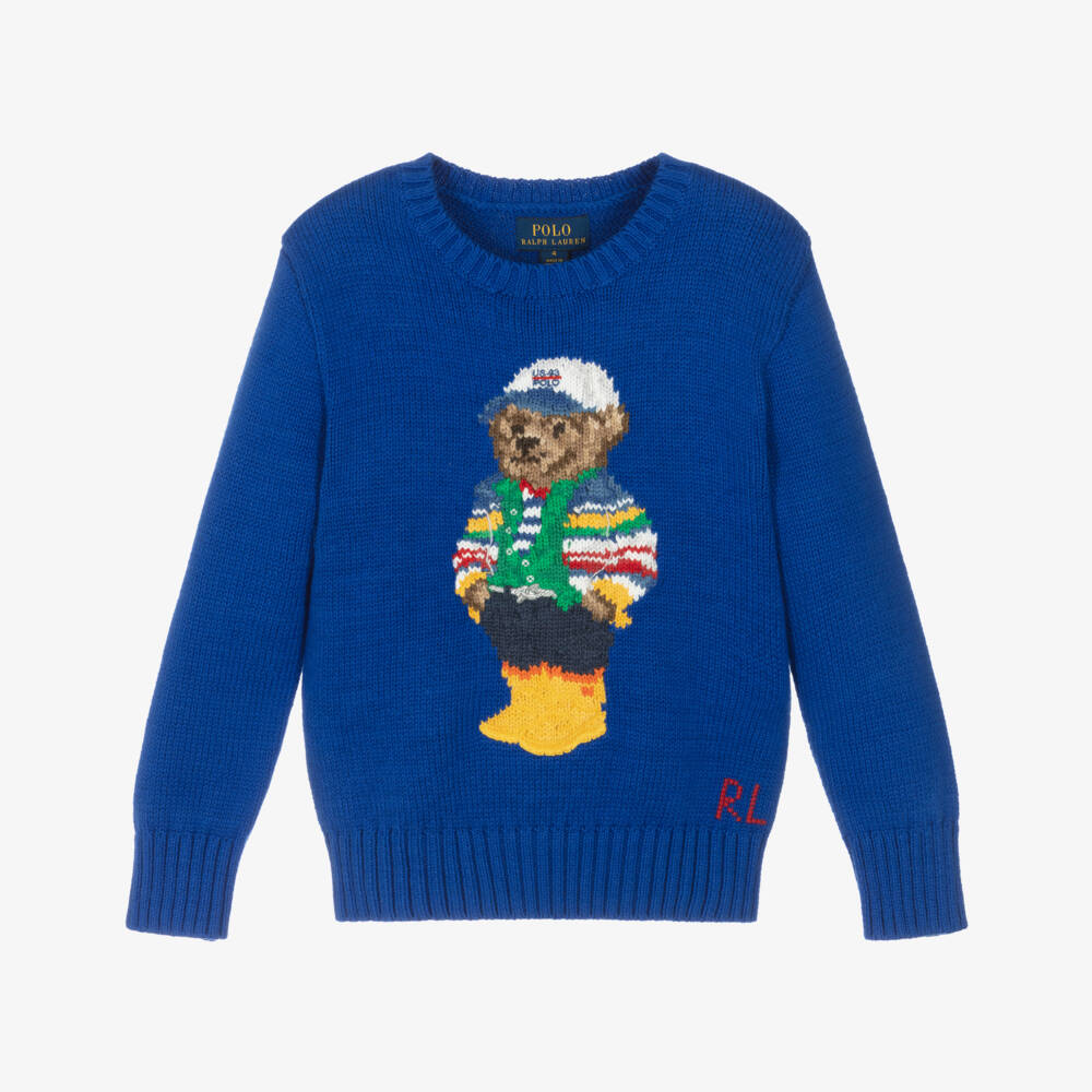 Knitted in soft cotton, this royal blue sweater for boys is by Ralph Lauren. The designer's iconic Polo Bear is depicted on the front, in a colourful intarsia-knit, together with the brand's initials in red.