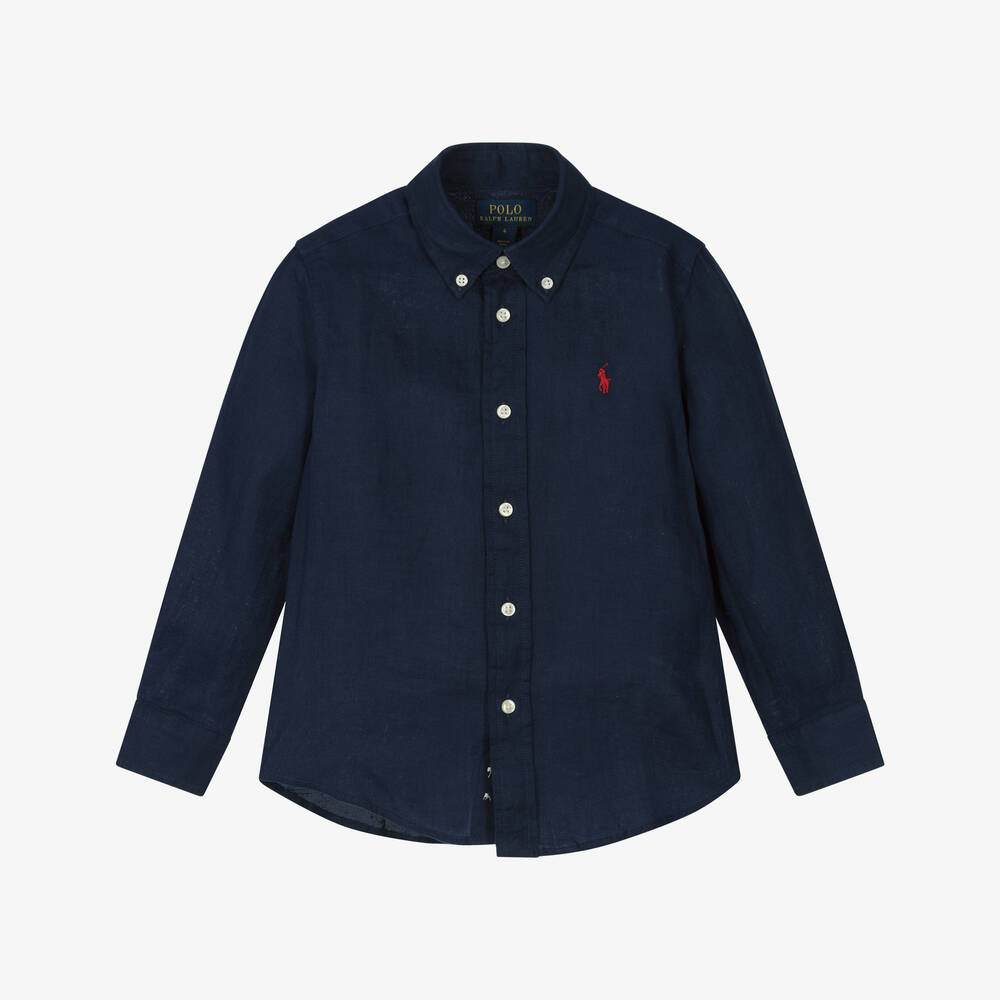 A classic navy blue linen shirt for boys by Ralph Lauren, with a button-down collar. Luxuriously soft and lightweight for warmer days, it has the brand's pony logo embroidered in red on the chest for an instantly recognisable signature look.