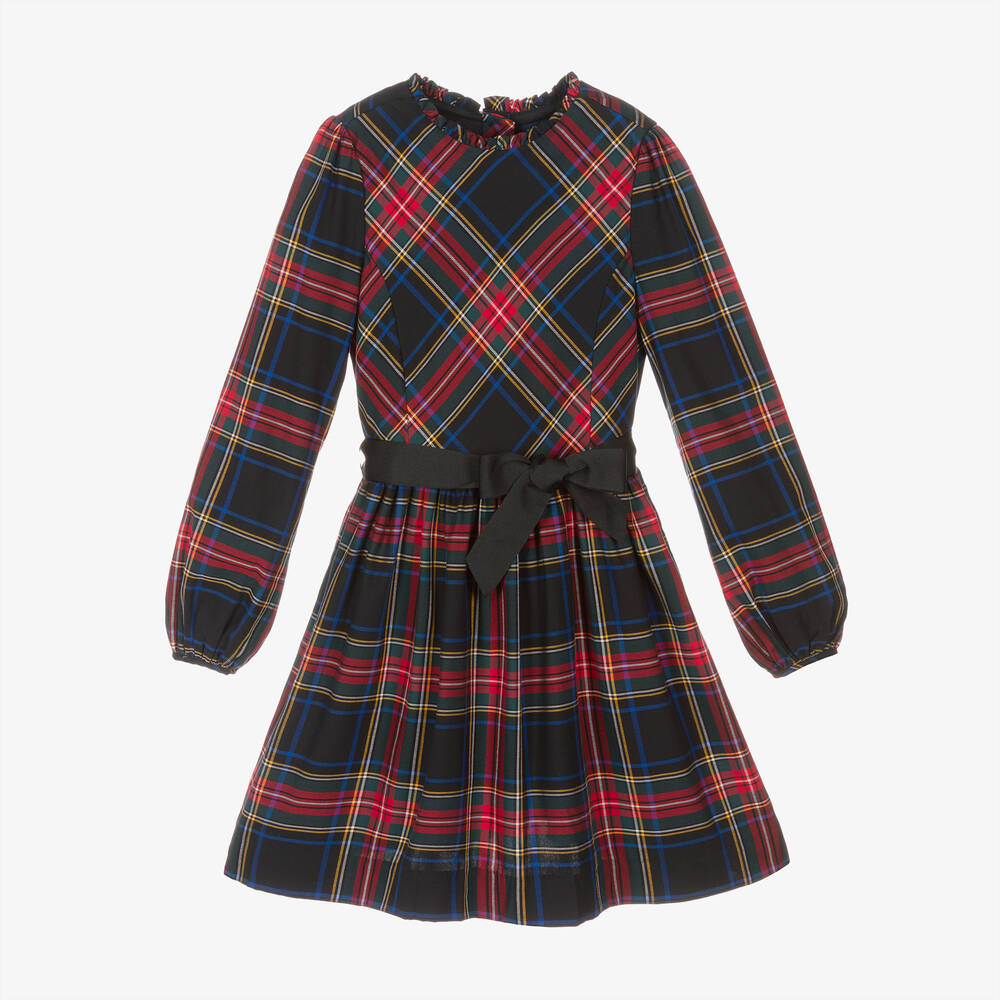 Patterned in heritage tartan, this black dress for girls is designed by Ralph Lauren. Softly woven in cotton twill, it has puffed sleeves, a ruffle-trimmed collar and a black satin sash belt around the waist. There are fabric-covered buttons on the back to fasten the style elegantly.