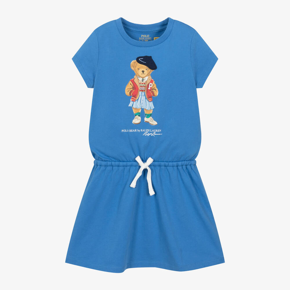 Pretty blue dress for girls by Ralph Lauren, made in soft cotton jersey. It has a preppy, beret-wearing Polo Bear printed on the front, capped sleeves and an elasticated waist for comfort and shape. There are button fastenings on the back of the neck for a classic finish.