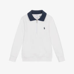 Varsity-inspired white and pink sweatshirt for girls by Ralph Lauren, made in soft cotton jersey. It has a sporty quarter zip on the front and white 'Polo' branding stamped across the chest.