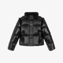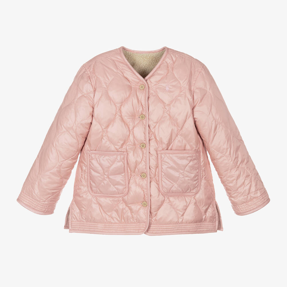 Offering two stylish looks in one, this reversible, V-neck jacket for girls by Ralph Lauren is down filled for cosy warmth. The silky smooth and water-repellent pink side has a lovely quilted design, while the reverse is made in beautifully soft, ivory teddy fleece. Fastening with buttons, both sides have useful front pockets and the longer length design is finished with a split hem for ease of movement.