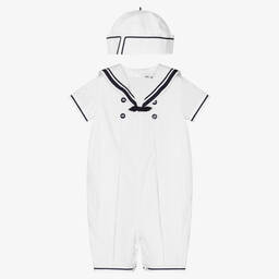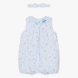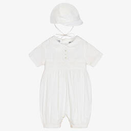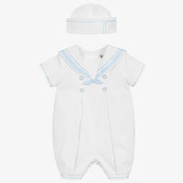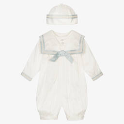 Traditionally styled, pale blue babysuit and hat set for boys by Sarah Louise. This charming set is made in soft, lightweight cotton-blend poplin, beautifully hand-smocked and hand-embroidered with tonal blue and white detaiing. The long-sleeved romper has a rounded collar, decorative side tabs, cuffed legs and button fastenings. The matching cap is elasticated on the back and has a detachable strap to fasten under the chin.