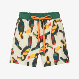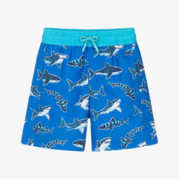 Boys blue and white swim shorts by Shade Critters, made in soft fabric with UPF 50+. These lightweight shorts are patterned with surfing dinosaurs on a contrasting striped background. Lined with comfortable mesh, they have an elasticated drawstring waist to adjust the fit. They have two side pockets and an additional velcro pocket on the back.