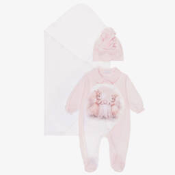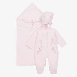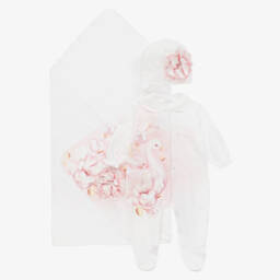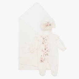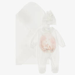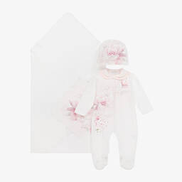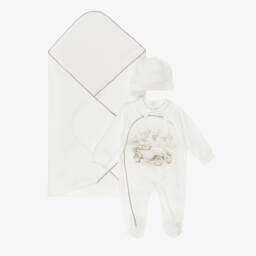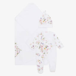 Exclusive to Childrensalon, this white and pale blue babysuit set for baby boys is by Sofija. Made in super soft and lightweight cotton jersey, each piece has a matching blue star button print and pale blue stitching. The babygrow has a crossover front with popper fastenings for easy dressing. A lightly padded blanket and soft layette hat complete the lovely set.