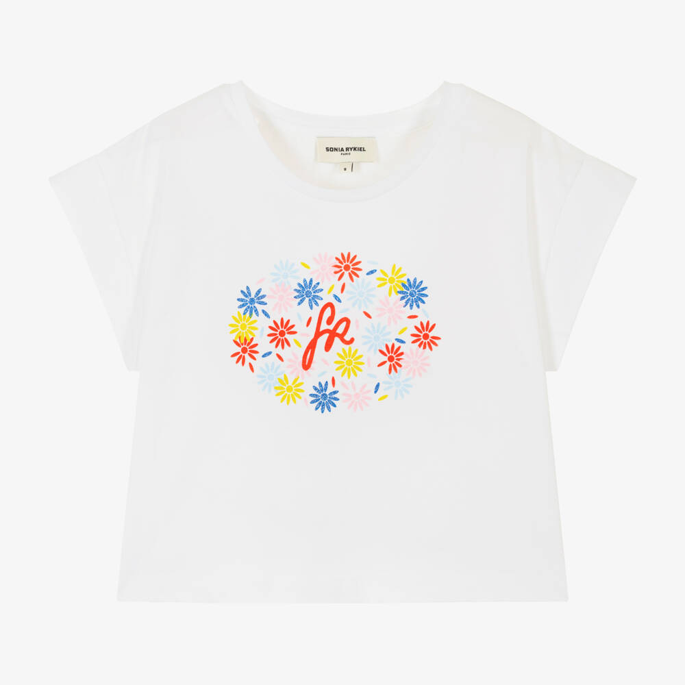 A white cotton T-shirt for girls by Sonia Rykiel Paris, with a colourful and glittery flower logo design on the front. Soft and stretchy in a stylish boxy fit, this casual top has dropped shoulders and capped sleeves.