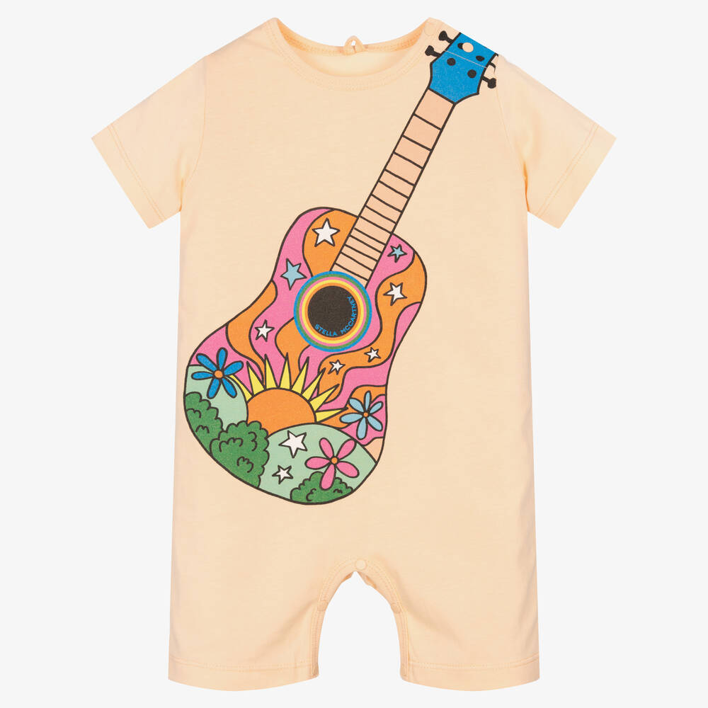 Super cute and quirky, this pale orange cotton shortie for baby girls is by British brand Stella McCartney Kids. Made in comfortable jersey, it has a colourful, '60s-style guitar and flower power print on the front, with a central logo. There are useful popper fastenings on one shoulder and between the legs for speedy dressing.