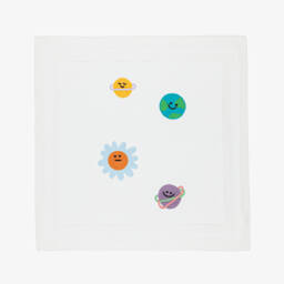 Pale pink blanket for baby girls by Stella McCartney Kids, with smiling daisy appliqués in yellow and green on the front. Knitted in soft organic cotton, this cute blanket is ideal for use in the car seat or stroller, and also makes an attractive nursery accessory.