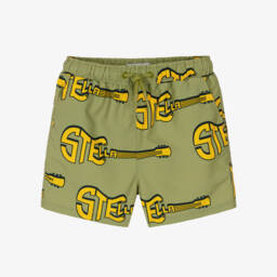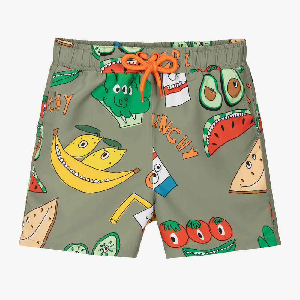 Patterned in fun and colourful fruit and vegetable prints, with slogan lettering, these khaki green swim shorts for boys are by Stella McCartney Kids. Made from silky recycled fabric with a soft mesh lining, they have slanted front pockets, a velcro-fastening back pocket with eyelets, and an orange drawstring to adjust the elasticated waist. The Stella McCartney fit can be quite small so choose a size up if you want room to grow.