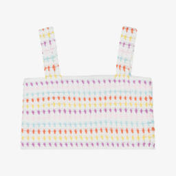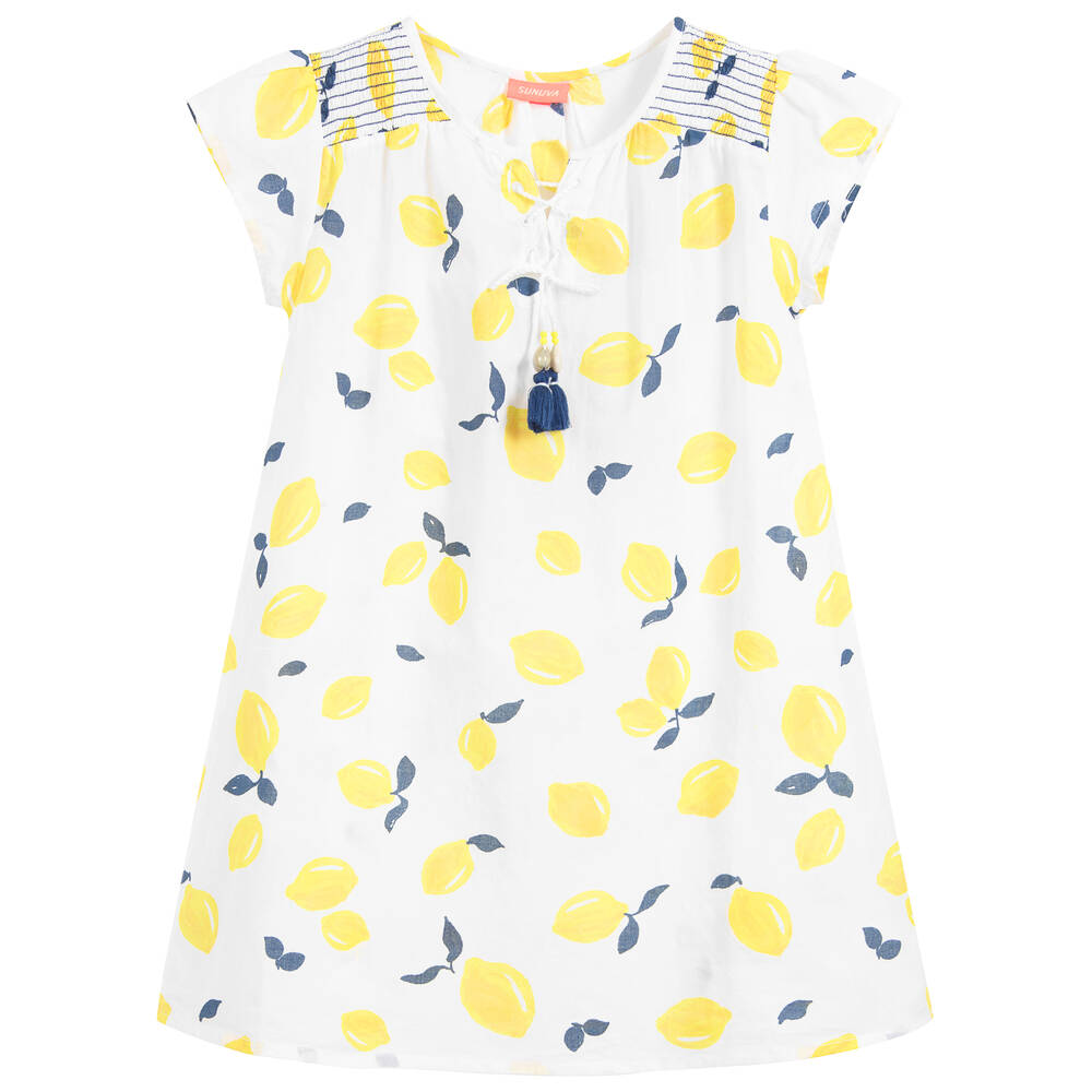 Made in soft and lightweight cotton, this girls kaftan dress is by Sunuva. In white with a fresh Sicilian lemon print, it has pretty ruching across the shoulders and tassel ties on the front.