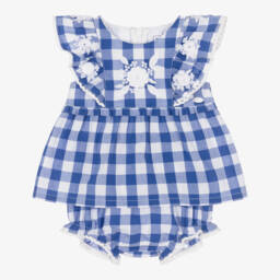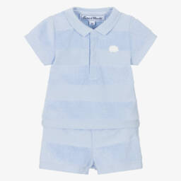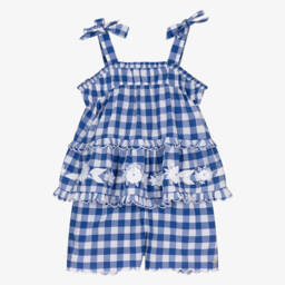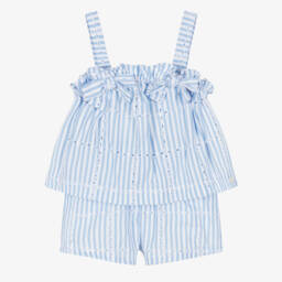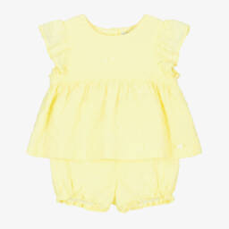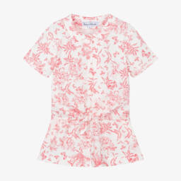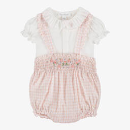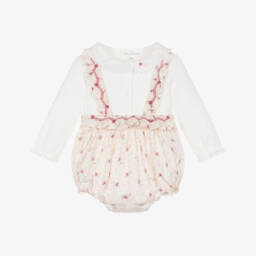 Pale pink cotton shorts set for baby girls by Tartine et Chocolat, beautifully embroidered with a pink, yellow and blue floral design. Soft and lightweight, the top has pretty ruffle sleeves and back button fastenings. The matching shorts have gently elasticated trims and an adjustable waistband for a comfortable fit on little tummies.