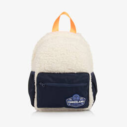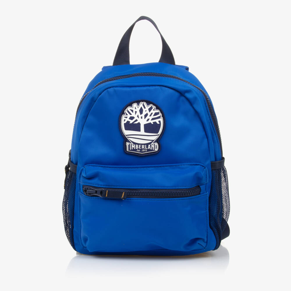 A bright blue backpack for boys by Timberland, made in smooth and durable canvas. The main compartment and front pocket fasten with a zip and the mesh pockets on the sides provide extra space for small items or a drink bottle. It has a rubberised white logo patch on the front and quilted branding on the back. The padded shoulder straps are adjustable and there is also a carry handle.