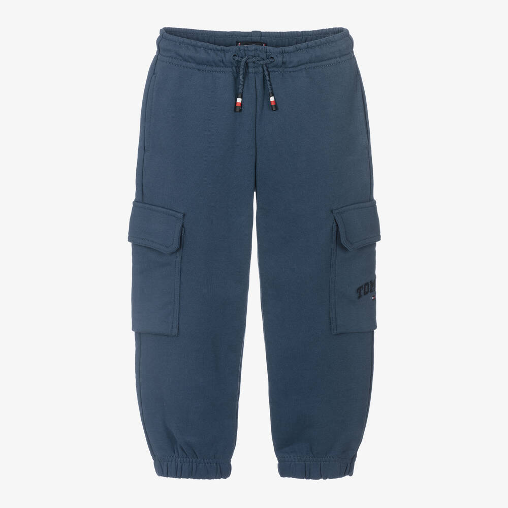 Boys blue joggers by Tommy Hilfiger, made in soft, mid-weight cotton jersey. Great for casual dressing, they are styled with roomy cargo pockets and gently elasticated cuffs. The brand's name is embroidered on one leg in navy blue and the signature detailing adds an extra pop of colour to the drawstring tips. A small flag motif is embroidered on the back below the waistband.