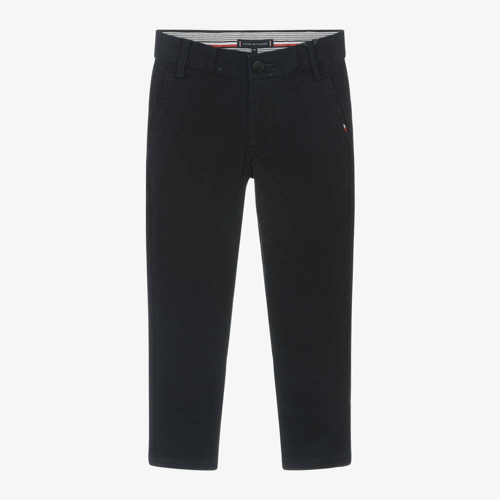 Navy blue, slim fit chino trousers for boys by American brand Tommy Hilfiger, ideal for both smart and casual occasions. Made in soft cotton twill with a slight stretch for comfort, they have signature striped detailing and an embroidered flag logo for a distinctive designer touch. The waist is adjustable for a great fit and they fasten with a zip and branded button. Completing this classic style are the slanted front pockets and buttoned back pockets.