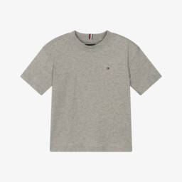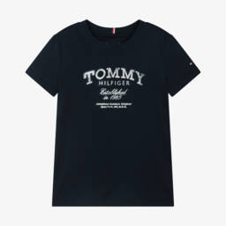 A navy blue organic cotton T-shirt for boys and girls from Tommy Hilfiger. An embroidered iconic flag, signature striped trim and a white logo print give this comfortable everyday casual staple a designer touch.