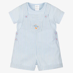 Charming white bodysuit and cotton dungarees set for baby boys by Tutto Piccolo. With blue, yellow and beige stripes, the lightweight seersucker dungaree shortie has a patch pocket on the front. It fastens with buttons on the back and underneath. A white jersey bodysuit with an embroidered collar and popper fastenings completes the set.