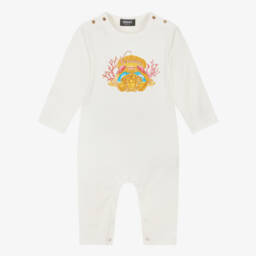 Lovely pink romper for baby girls by luxury Italian designer Versace, made in soft cotton jersey. With easy-to-fasten poppers on the back and between the legs for fuss-free dressing, this lovely piece has a fun necklace print with the iconic Medusa logo subtly featured.