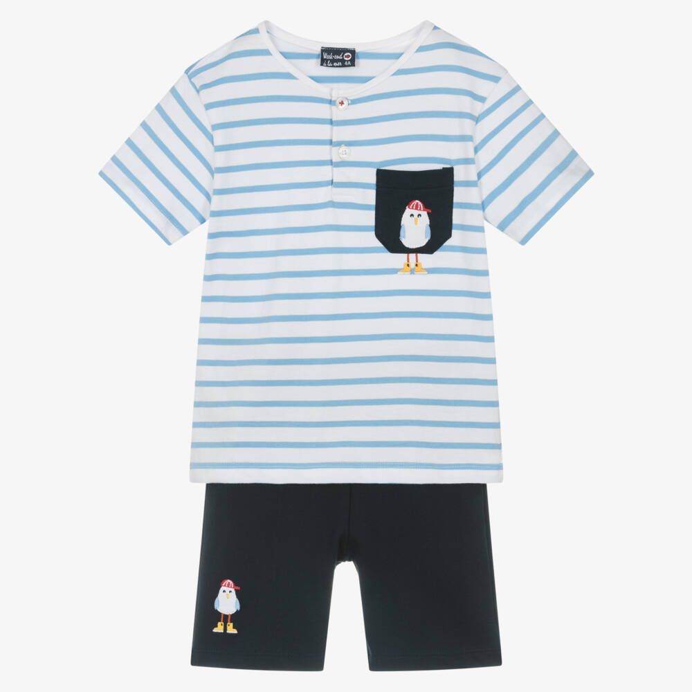 Сине-белый комплект с шортами для мальчиков от Week-end à la mer из комфортного хлопкового трикотажа. Тельняшка с двумя пуговицами и милым накладным карманом на груди. На спине изображены три чайки в стильных кепках и разноцветных ботинках. Шорты с эластичной талией для легкого и повседневного комфорта.