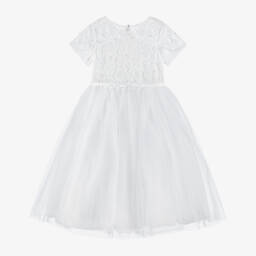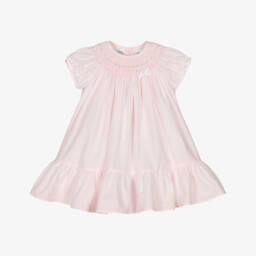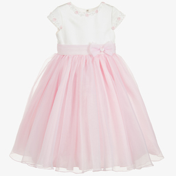 Strikingly beautiful, this pink dress for girls is by British brand, Sarah Louise. The fitted bodice is decorated in floral lace detailing, with capped sleeves and pretty pearl trims. The fixed bow sash accentuates the waist, whilst the layered tulle skirt creates volume and flare. There are decorative buttons on the back, which conceal the zip fastening. This dress is lined in a soft and smooth fabric.