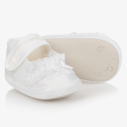 Baby girls adorable ivory pre-walker shoes by Sarah Louise made from a soft, silk organza. Perfect for that special occasion they have a delicate ivory lace trim with ribbon and pearl bow on the front. They are fully lined in a soft towelling, making them comfortable when worn, have a soft, faux leather sole and have ribbon ties to fasten around the ankle.