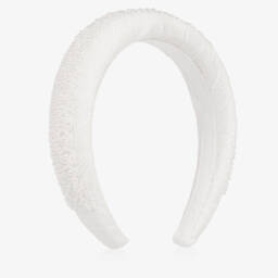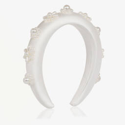 Lovely ivory hairband for girls by Self-Portrait with a narrow, flexible band covered with satin. Pretty, glittery organza flowers decorate the top along with sequins and beaded leaves. This charming accessory would add a delightful finishing touch to a special outfit.