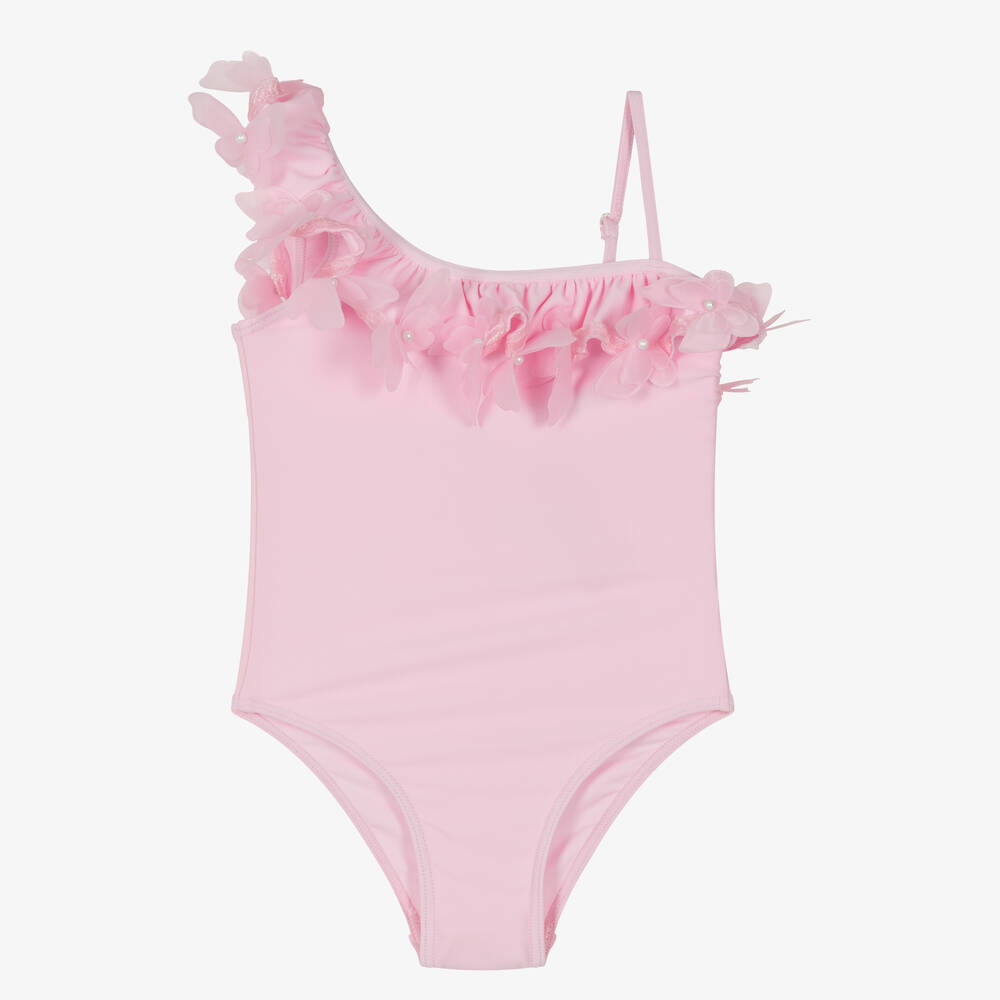 A pretty pink swimsuit for girls by Selini Action. Smooth and stretchy, it has lovely butterfly appliqués finished with pearls on the asymmetric ruffle trim. There is an adjustable shoulder strap on one side and a soft lining on the front for comfort.