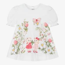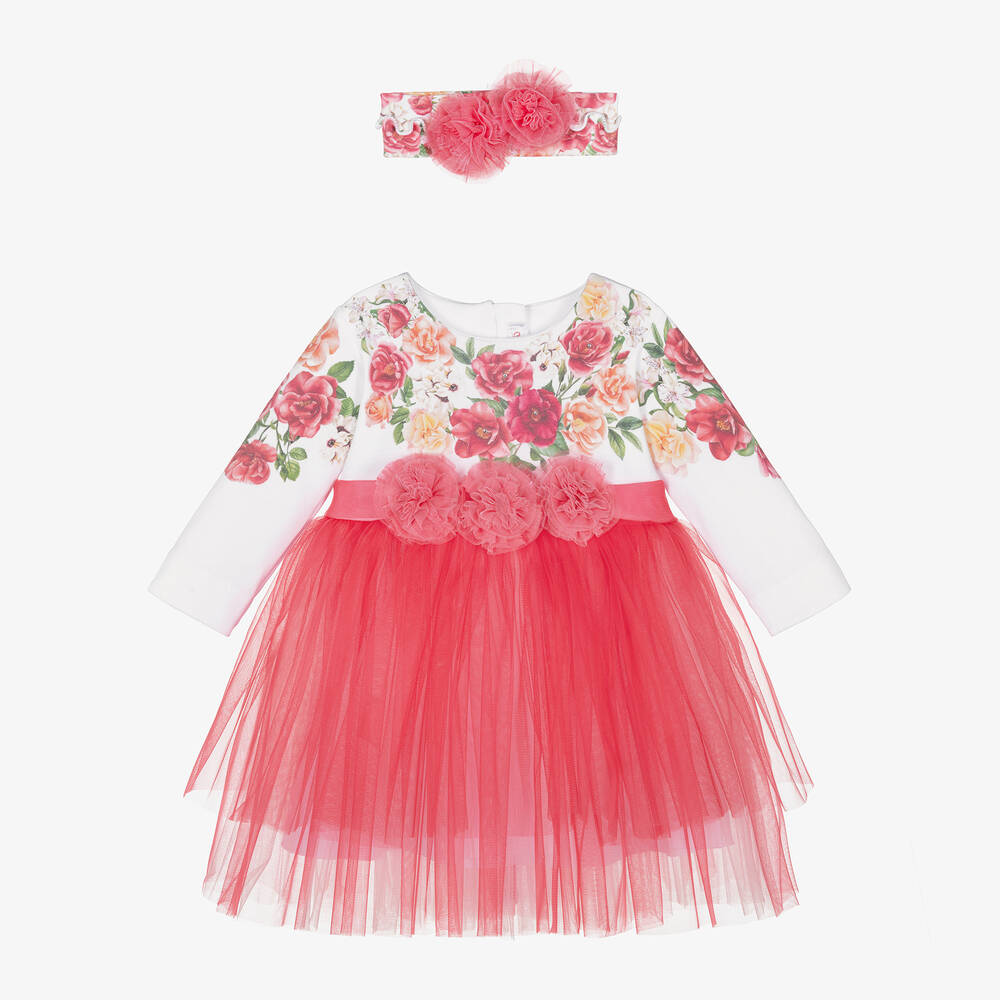 Pretty occasion dress for little girls by Sofija, with a beautiful rose pattern in shades of pink. Soft and comfortable to wear, it is made in white cotton jersey with layers of dark rose pink tulle on the skirt. The bodice is trimmed with diamantés for a touch of sparkle and the waistline is trimmed with beautiful tulle floral appliqués. A concealed zip fastening on the back gives a neat finish and a sweet matching headband completes the look.