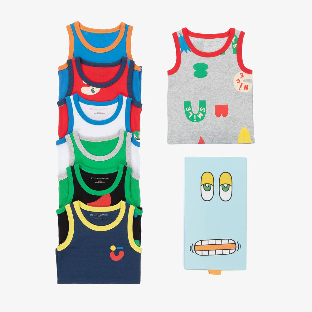 A pack of seven multicoloured vests for boys by Stella McCartney Kids, made in soft and strechy organic cotton jersey. One for everyday of the week, these round neck vests are printed with fun smiling faces and colourful shapes. All items come in a playful gift box for an extra special touch.