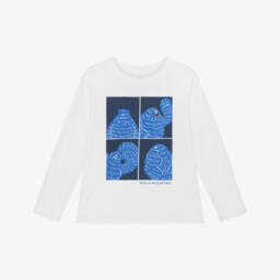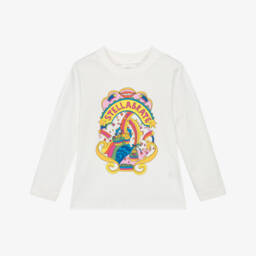 Ivory top for little boys by Stella McCartney Kids, made in organic cotton jersey for comfortable wear. This long-sleeved style has a blue tractor print on the front with bright green wheels. The sustainable designer's name is incorporated within the farm-themed design. The neckline is lightly ribbed and the popper fastenings on one shoulder help with dressing. The Stella McCartney fit can be quite small so choose a size up if you want room to grow.
