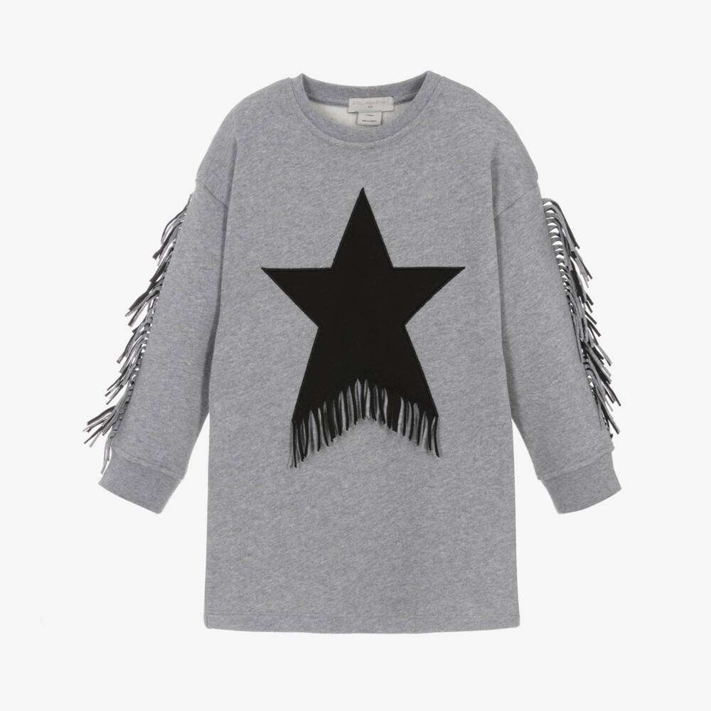 Grey marl organic cotton dress for girls by British label Stella McCartney Kids, with hidden side pockets. Trimmed with bohemian fringing, this sweatshirt dress has a black star appliqué on the front, dropped shoulders, and a fleece-feel underside for cosiness. The Stella McCartney fit can be quite small so choose a size up if you want room to grow.
