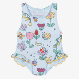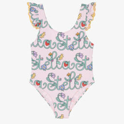Lilac purple swimsuit for girls by Stella McCartney, patterned with logos and flowers in pink and green. Ideal for the beach or the pool, it is UPF50+. Soft and silky, it is styled with racer back shoulder straps.
