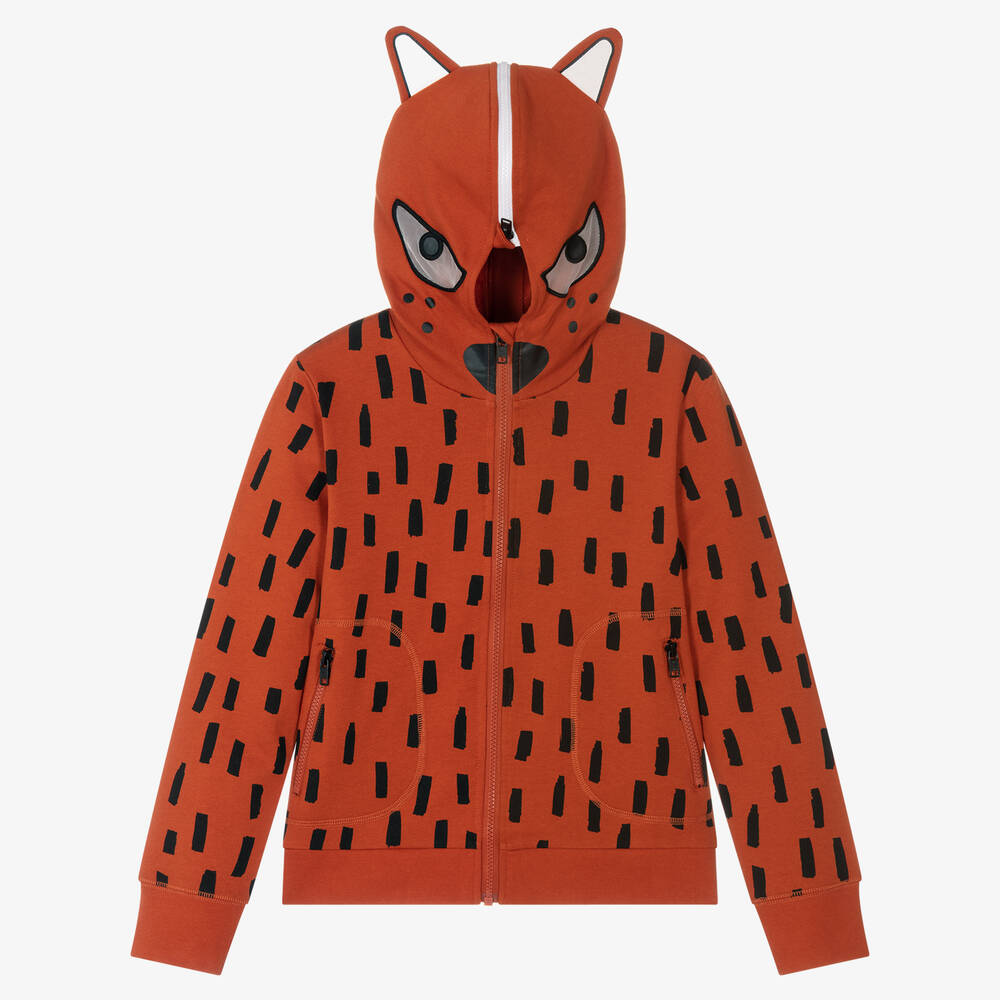 Rust brown fox mask zip-up hoodie for teen boys by Stella McCartney Kids. Patterned in a black dashed print, it has 3D fox ears on the zip-through hood with mesh eye inserts and is made in mid-weight organic cotton jersey. It has a zip fastening on the front with a protective zip guard under the chin. There are front zip pockets, stretchy ribbed cuffs, and thumbholes at the cuffs.