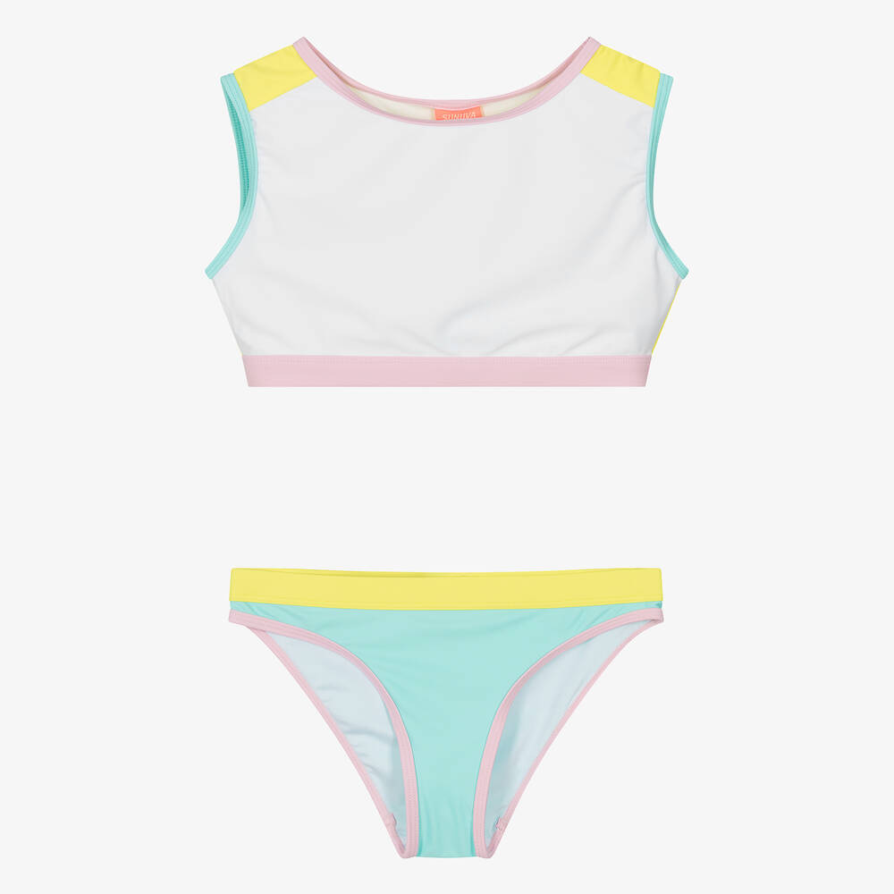 Teen girls pastel blue lined bikini for girls by Sunuva, in a sporty style. Ideal for achieving a cute pool-side look with an eco-conscious twist, this bikini is made using recycled materials. It has colourblock detailing in blue, yellow and pink colours, and comes with coordinating bottoms to complement the look.