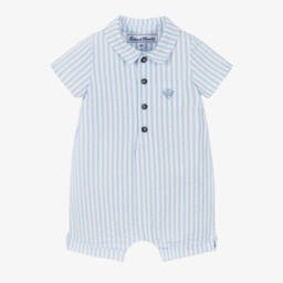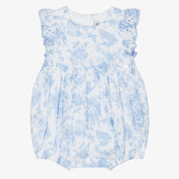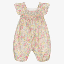 Delightful yellow gingham shortie for baby girls by Tartine et Chocolat, made in soft cotton seersucker. Partially lined in lightweight voile, the smocked bodice and scalloped shoulder straps are beautifully hand-embroidered with pretty daisies. There is a concealed zip fastening on the back, and buttons between the legs to help with changing.