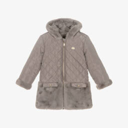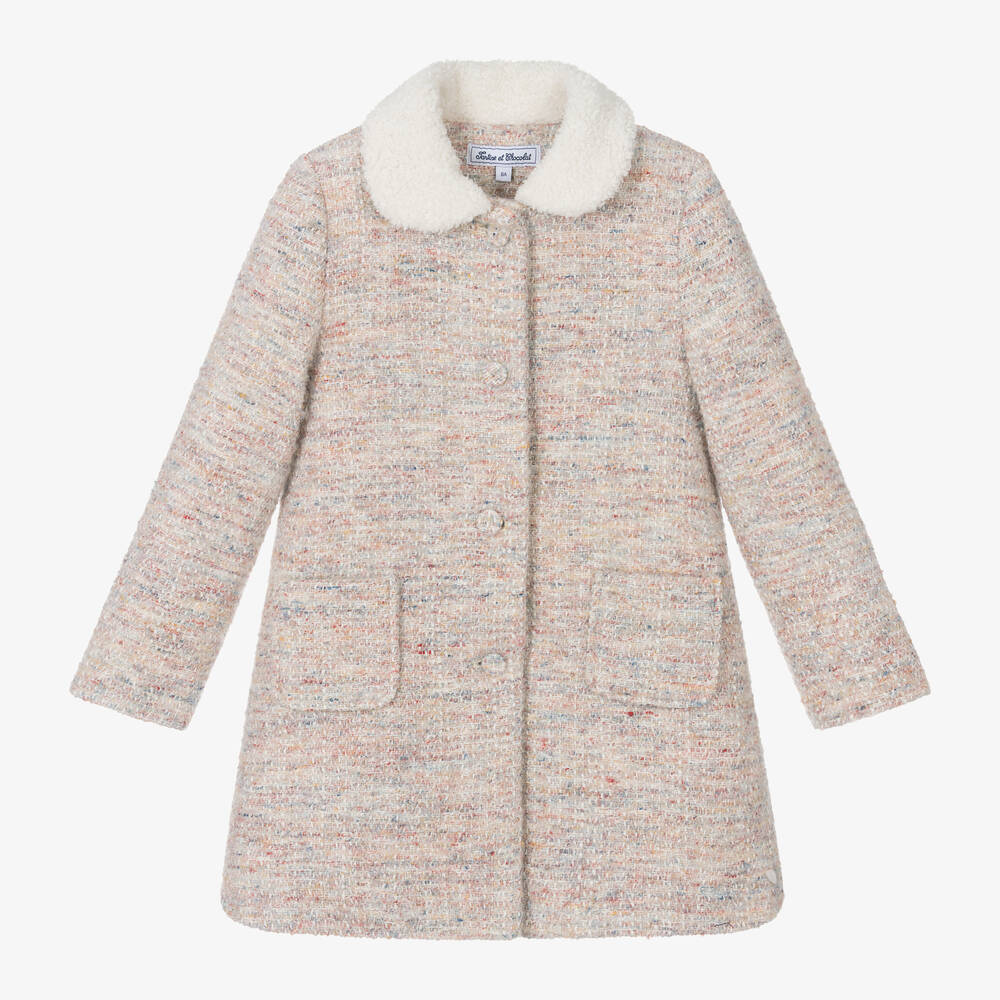 Elegant and stylish for girls, this beige and pink tweed coat is by French brand Tartine et Chocolat. It is made in a luxurious blend of wool, cotton and linen, with a contrasting ivory collar in soft sherpa fleece. Lined in silky satin for comfort, this smart coat fastens with fabric covered buttons down the front, and is trimmed with useful patch pockets.