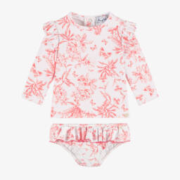 A white and pink tankini for little girls by Tartine et Chocolat. It is patterned in pretty florals, butterflies and hedgehogs, with charming ruffle trims. Silky soft and stretchy, the top fastens with poppers on the back and the bottoms are fully lined for comfort.