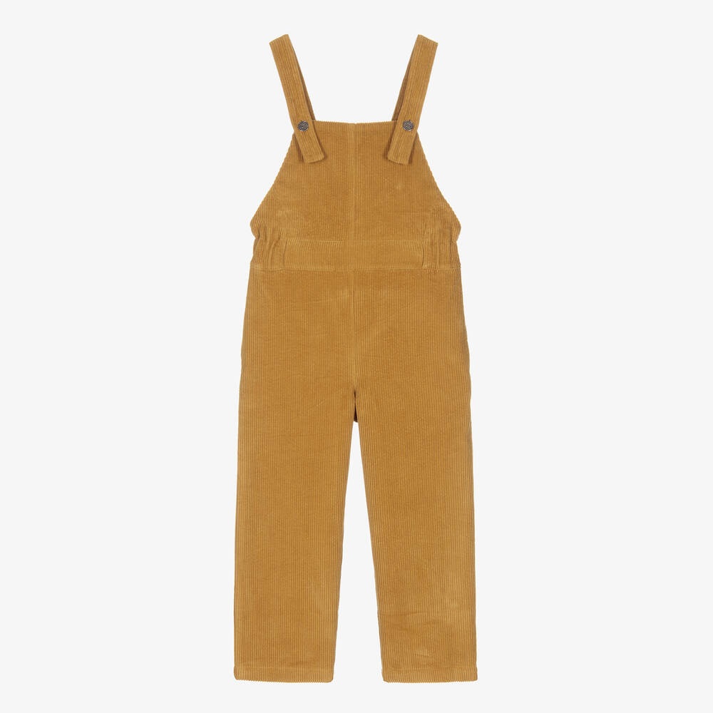 Teen girls mustard yellow dungarees by Spanish brand The New Society, made in soft, mid-weight organic corduroy. They have front button fastening shoulder straps and an elasticated panel on the back of the waistband. There are useful back pockets and concealed side seam pockets.