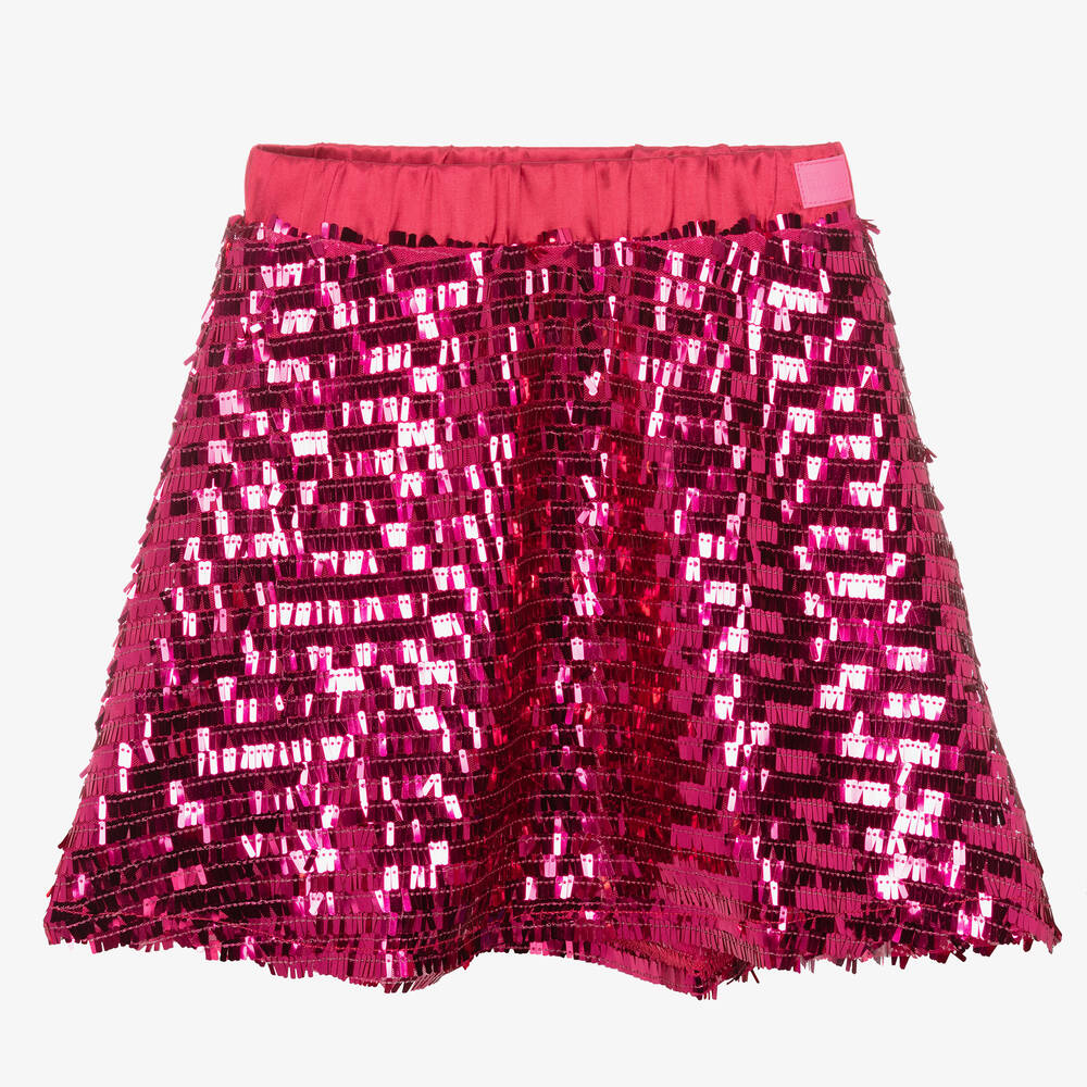 Eye catching pink skirt for girls by The Tiny Universe, made from lightweight tulle and embellished with bright pink mirror sequins. This skirt is lined in silky satin and has a pink elasticated waistband for a great fit. Ideal for a special occasion, it is finished with a pink designer logo patch on the waist for an added branded touch.
