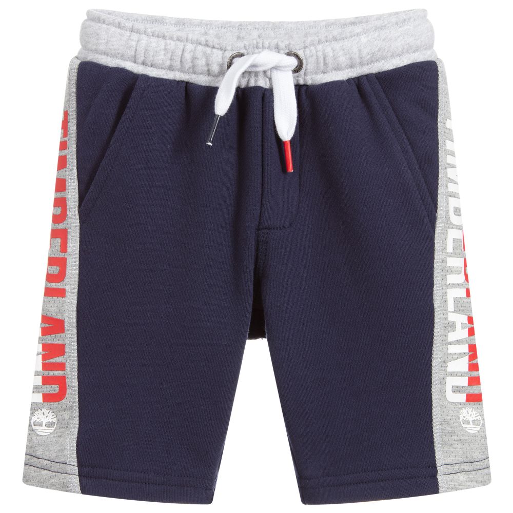 Boys navy blue shorts from Timberland. Made in soft mid-weight cotton sweatshirt jersey, they have grey trims with white and red logo prints down each leg.
