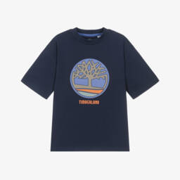 Navy blue organic cotton T-shirt for little boys by Timberland, with the brand's signature Tree logo printed on the front in white and yellow. Made in comfortable jersey with poppers on one shoulder to help with dressing, it is ideal for relaxed, casual days.